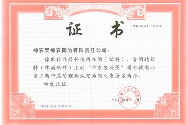 2014年11月,神農架神農御酒有限責任公司注冊使用在酒(飲料)、含酒精飲料(啤酒除外)上的”神農架及圖“商標被湖北省工商行政管理局認定為湖北省著名商標。